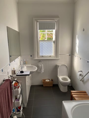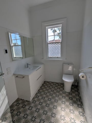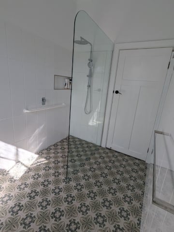 The renovation transformed this bathroom into a bright, modern sanctuary that balances clean minimalism with striking vintage-inspired details. The space was updated with crisp white wall tiling and a sleek white vanity, creating an airy feel that is amplified by the abundance of natural light from the sash window. A bold, patterned tile floor in muted grey and green tones serves as the room’s focal point, grounding the neutral walls with a touch of character. The layout was thoughtfully redesigned for both style and accessibility, featuring a seamless walk-in shower with a frameless curved glass partition, a rainfall showerhead, and strategically placed grab rail and fixtures that complete the high-end, functional finish.