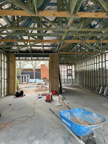 This contemporary extension in Albury transforms the home with a light-filled open-plan living space and striking architectural detail. The build features a raked ceiling with exposed structural framing, polished concrete floors, and expansive glazing that seamlessly connects the indoors to the landscaped backyard. A sleek, modern kitchen anchors the space, complete with a large island, custom cabinetry, and high-end finishes. The result is a spacious, airy addition that blends clean lines with warmth and functionality, creating a beautiful and practical family living area.